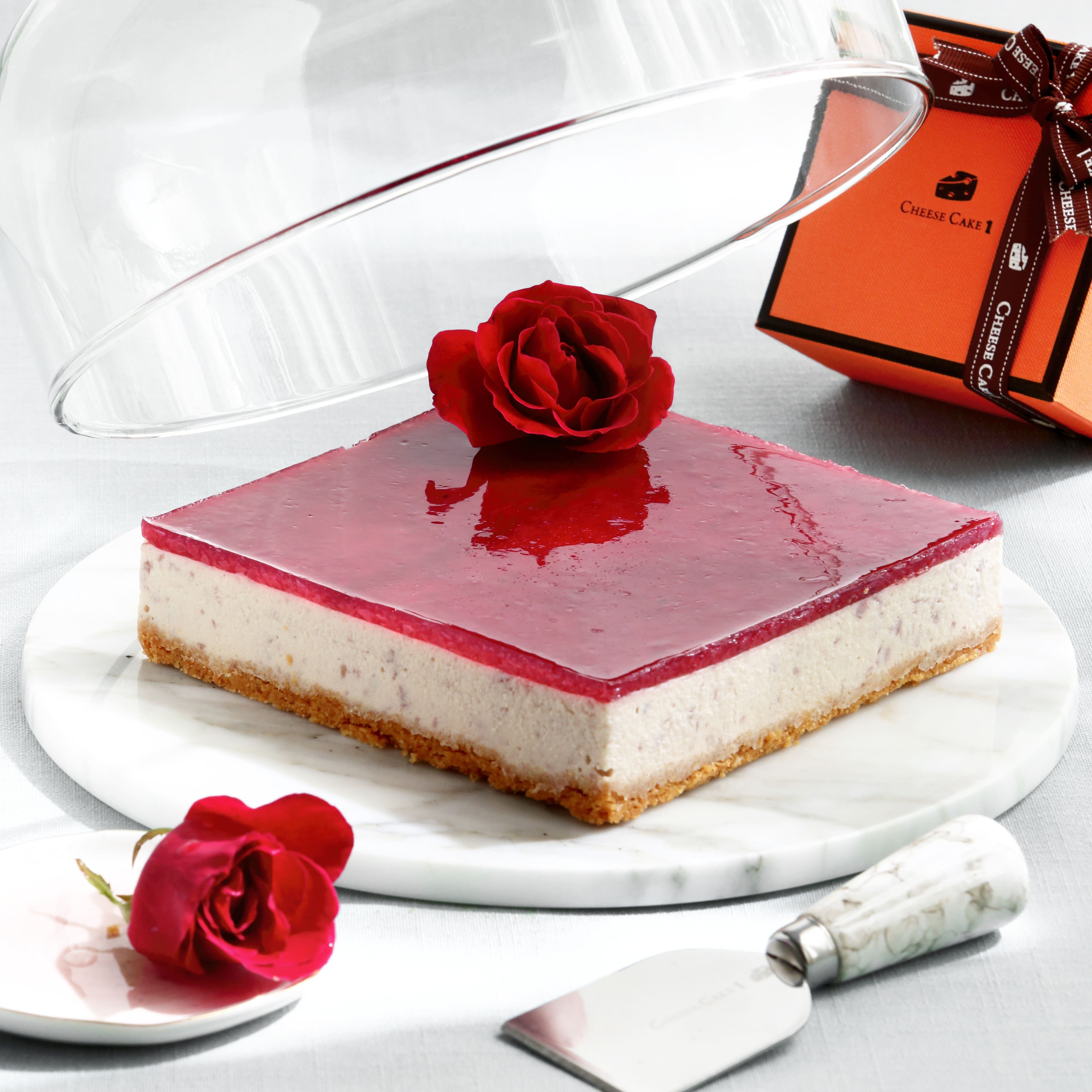 【愛,玫說】清香玫瑰生乳酪蛋糕:以可食用玫瑰花瓣與果凍層點綴,花香清新淡雅,搭配柔滑乳酪體,風味細膩優雅,外型與口感兼具,常被選作生日或節慶送禮款式。